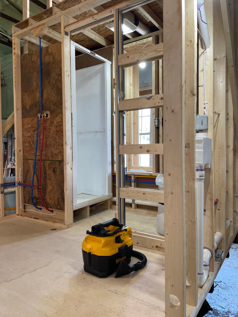 The cold and hot water pipes are in! The shower is actually quite spacious! If you look closely you can see the composting toilet on the right hand side of the pic! Wandering how a composting toilet works? Don’t worry that will have it’s own post later…!